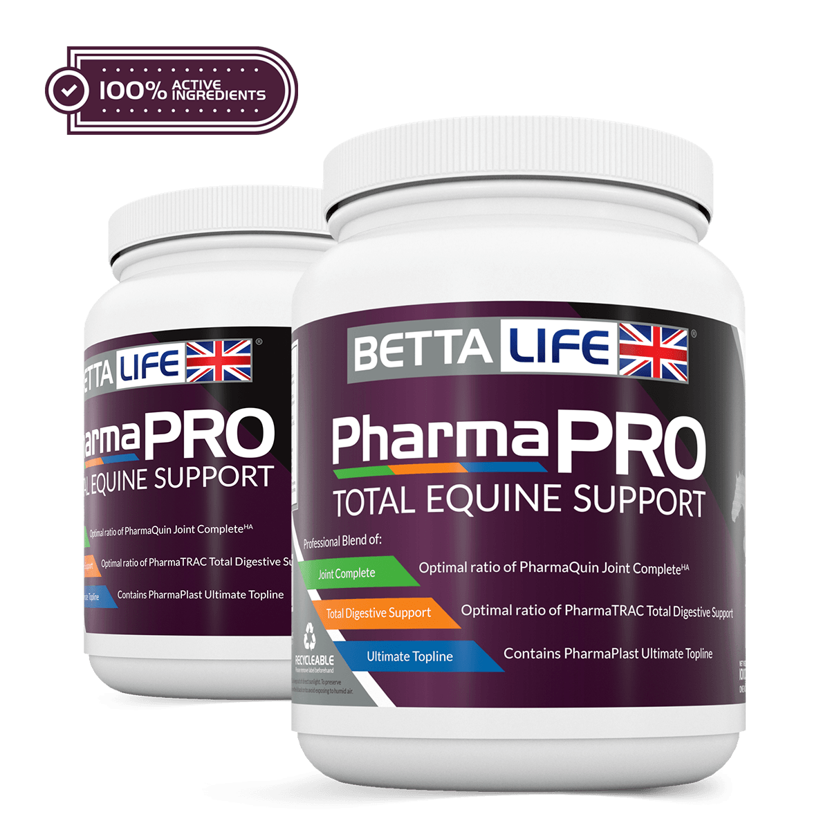 PharmaPRO offers a unique blend of the three existing BETTALIFE® equine products – PharmaPlast Ultimate Topline, PharmaTRAC Total Digestive Support and PharmaQuin Joint Complete HA. Formulated from 30% PharmaQuin, 30% PharmaTRAC and 40% PharmaPlast blend, this ratio provides total support with optimum levels of thirty-five active ingredients. PharmaPRO has been created for riders on the go, providing horses with one scoop a day and saving time, hassle and measuring – invaluable if time is short or for horses on full livery and competition yards.